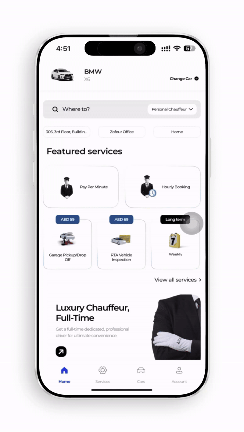 Choose between a Personal Chauffeur or Car Movement (book by the minute, hour, day, week, or month)