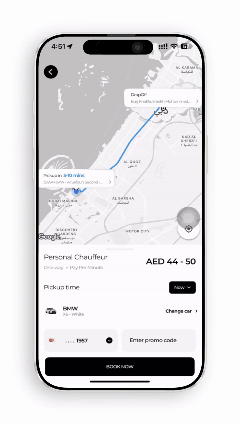 Simple, open the mobile app, select your pickup location and destination (to see estimated fare calculated per minute basis). Your driver will be dropped at your car in no time.